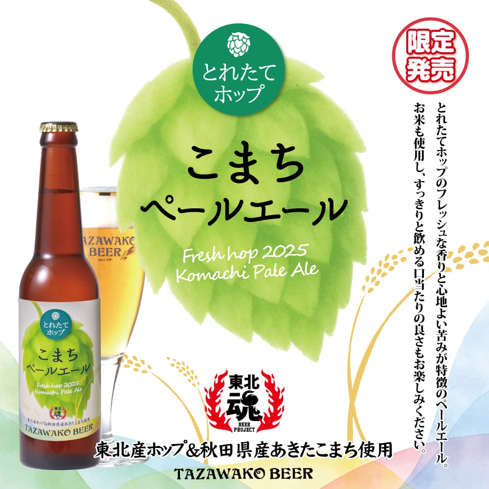・とれたてホップ こまちペールエール/原材料:麦芽(ドイツ製造)・米・ホップ/スタイル:ペールエール/アルコール度数:5%/IBU:35